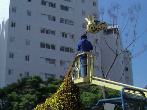 Листва только зазеленела, а Жирафа уже стали ремонтировать, досаживать цветы, менять голову, привязывать хвост...