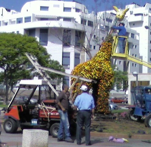 Листва только зазеленела, а Жирафа уже стали ремонтировать, досаживать цветы, менять голову, привязывать хвост...